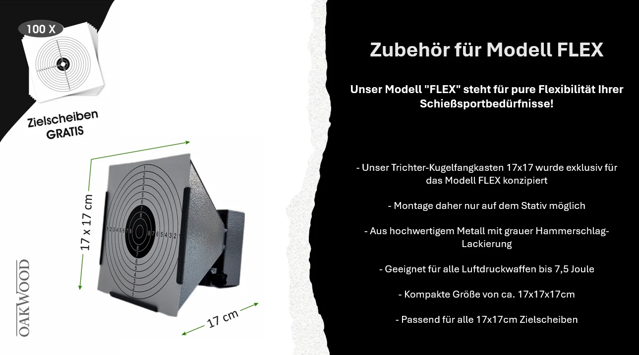 - optionales Zubehör: zusätzlicher Trichter-Kugelfangkasten 17x17cm inkl. 100x Ring-Zielscheiben extra erhältlich (= Variante: "Zubehör FLEX 17x17")