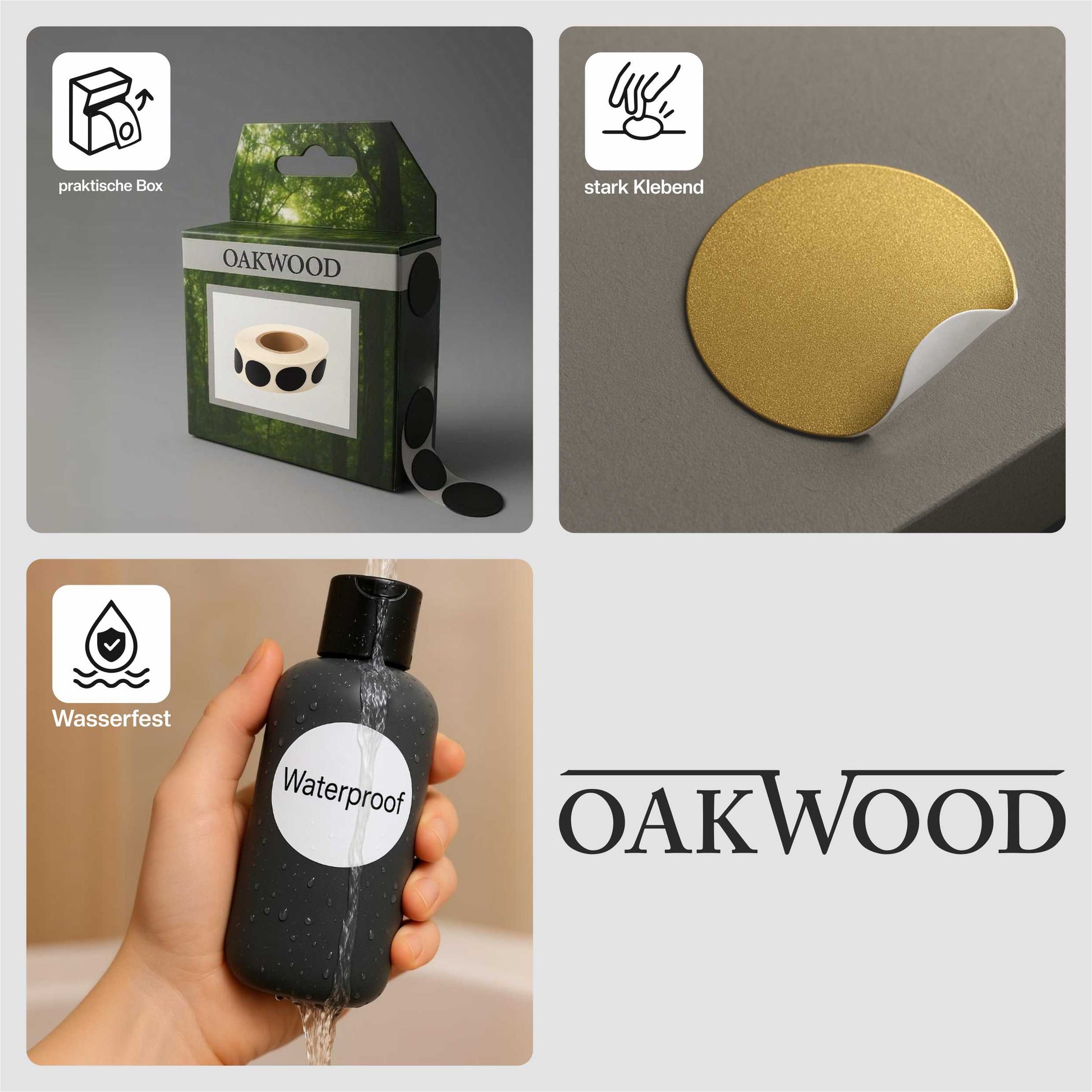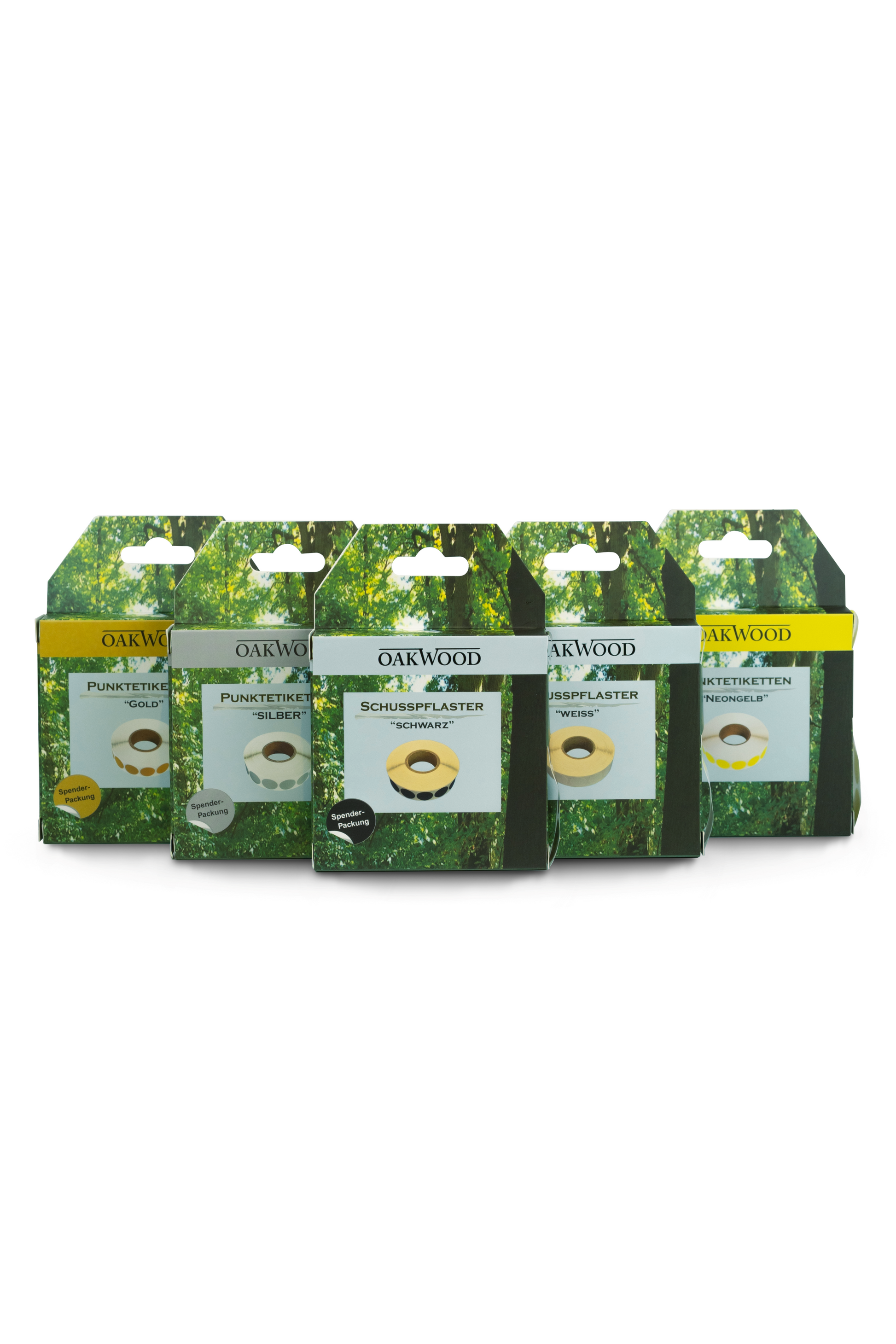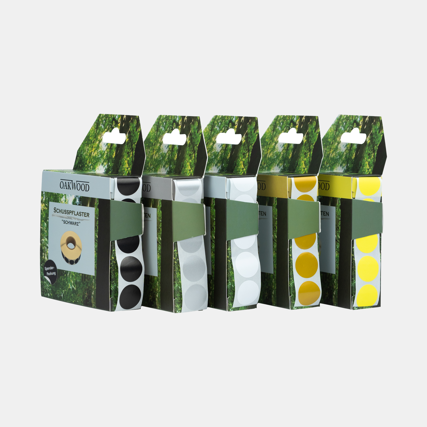 OAKWOOD Schusspflaster & Punktetiketten rund | Ø19mm – 2.000 Stück in Spenderbox | Schwarz, Weiß, Gold, Silber, Neongelb