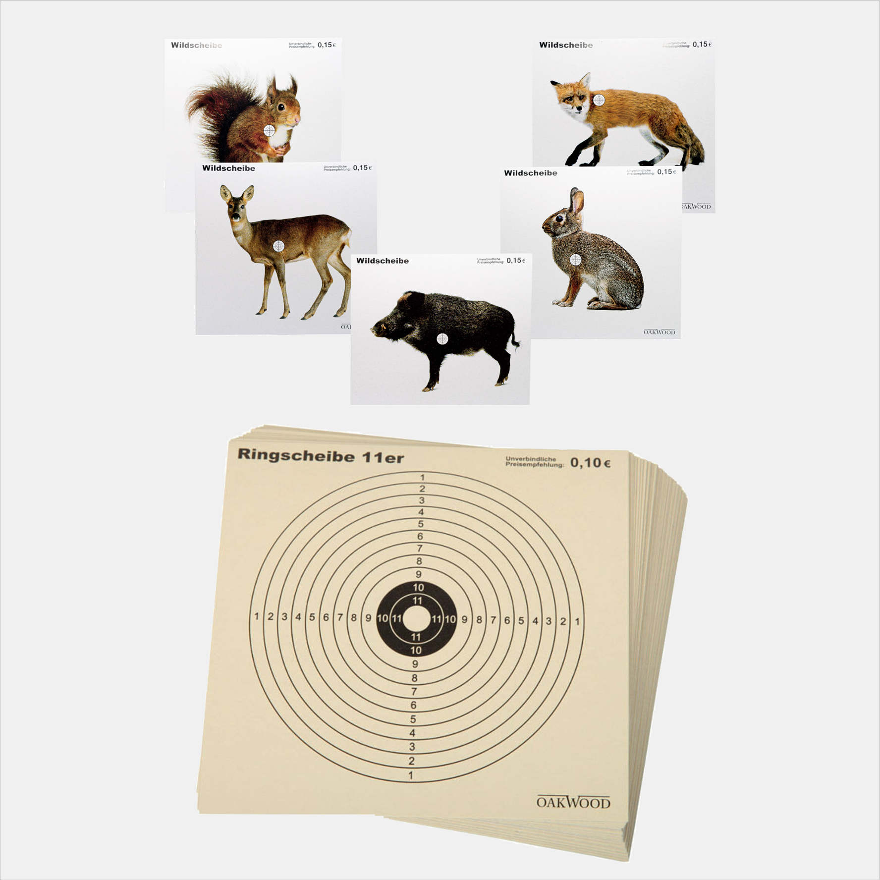 - Motive bei 14x14 Zielscheiben: 11er-Ring, Wildmotiv (je 10x Reh, Hase, Eichhörnchen, Fuchs, Wildschwein)